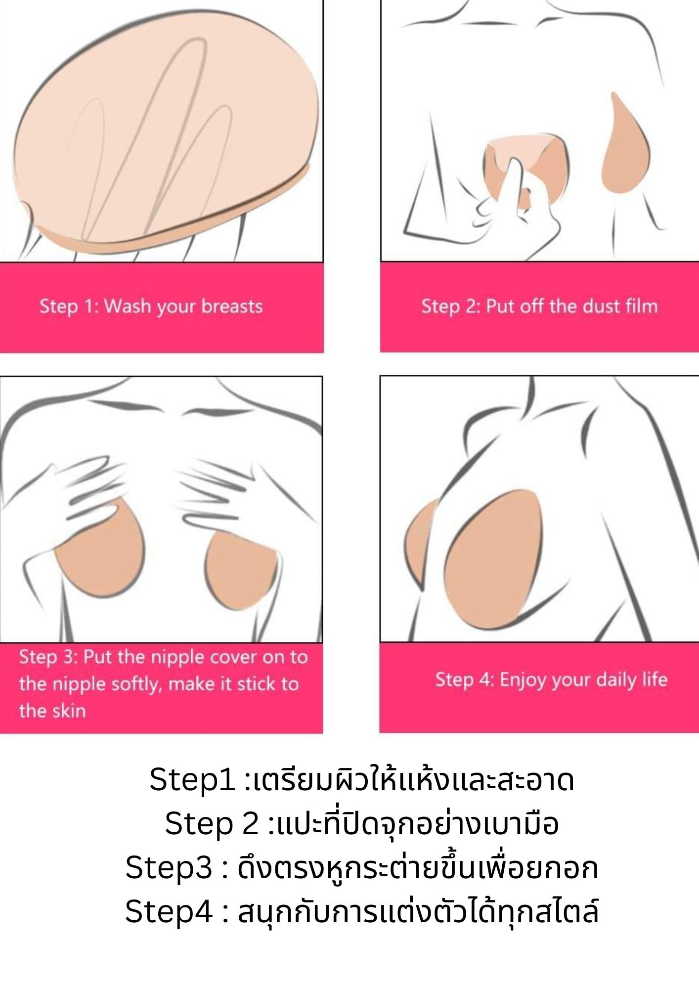 วิธีการใช้ : ห้ามทาครีม โลชั่น แป้ง หรือน้ำหอม บริเวณที่ใส่บรา ควรเป็นผิวแห้งและสะอาด ลอกแผ่นพลาสติก แปะที่ปิดจุก จากนั้นดึงยกส่วนที่เป็นหูกระต่ายตัวช่วยยกให้กระชับขึ้นตามที่ต้องการ กดบราปิดจุกให้เรียบแนบสนิทกับผิว